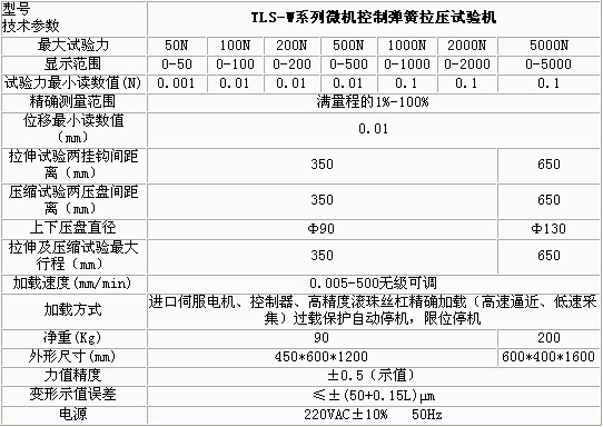 產(chǎn)品概述: TLS-WI系列微機控制拉壓彈簧試驗機依據(jù)JB/T7796-2005《拉壓彈簧試驗機技術(shù)條件》規(guī)定的技術(shù)要求制成。該型拉壓彈簧試驗機主要用 于測試各種螺旋彈簧及彈性元件的強度,即在一定的變形量(或高度)下測試彈簧的試驗力或在一定的試驗力下測定彈簧的高度或變形量。 功能特點: 本機主要適用于各種彈簧的強度試驗、力學(xué)性能及工序能力分析。 本機軟件包有速度控制、參數(shù)輸入、數(shù)據(jù)處理、結(jié)果觀察、圖表顯示、圖表打印、數(shù)據(jù)保存等功能模塊組成。 試驗方式多樣化,可以設(shè)置彈簧的試驗力,檢測彈簧的剩余高度或變形量;也可以設(shè)置彈簧的剩余高度或變形量,彈簧拉力試驗機價格,檢測試驗力等功能。 多點自動變速采集數(shù)據(jù),并自動返回到初始位置,整個試驗過程自動化。 過載自動返回,以保護傳感器不受損壞。 具有強大的數(shù)據(jù)處理及數(shù)據(jù)統(tǒng)計功能,繪制剛度曲線、計算彈簧的分段剛度,彈簧拉壓試驗機檢定規(guī)程,可以進行數(shù)據(jù)統(tǒng)計,繪制正態(tài)分布圖、計算工序能力指數(shù)。采用數(shù)控電機調(diào)速系 統(tǒng)或進口交流伺服電機及調(diào)速器和精密滾珠絲杠副組成傳動系統(tǒng),與高精度負荷傳感器、位移傳感器及數(shù)字式數(shù)據(jù)采集卡、PC組成測控系統(tǒng),桂林瑞特彈簧試驗機,實現(xiàn)了穩(wěn)定可靠運行 及精確測量。 技術(shù)參數(shù): ![]() ![]()
