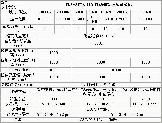產(chǎn)品概述: TLS-SII系列全自動數(shù)顯式拉壓試驗機是適用于拉壓試驗的新型試驗設(shè)備。試驗機主機的設(shè)計具有外形美觀、操作方便、性能穩(wěn)定可靠的特點。試驗機 采用數(shù)控電機及先進的單片機控制技術(shù)加載及控制,能實現(xiàn)雙速預(yù)置。實現(xiàn)了高速逼近,低速采集。提高了測試精度,保證了試驗效率。 功能特點: 自動變速檢測5個測試點,并自動返回到試驗初始位置 LED顯示,彈簧拉壓試驗機價格,人機對話直觀明了便于操作 可以選擇多種測試方法,順次自動完成一批工件的測試,可查看已測數(shù)據(jù) 傳感器引起的變形量可以補償,彈簧拉壓力試驗機,既傳感器和整機剛度引起的變形不影響位移精度。 可實現(xiàn)試驗力、試驗速度、位移等多種控制方式,具有以下功能: 設(shè)定變形量F,檢測彈簧的試驗力P; 設(shè)定彈簧的剩余高度H,檢測彈簧的試驗力P; 彈簧變形的檢測已工作壓盤接觸彈簧為準(zhǔn),彈簧壽命試驗機,此時試驗力有反應(yīng),試驗力(初始力)的大小任意設(shè)定。 技術(shù)參數(shù):