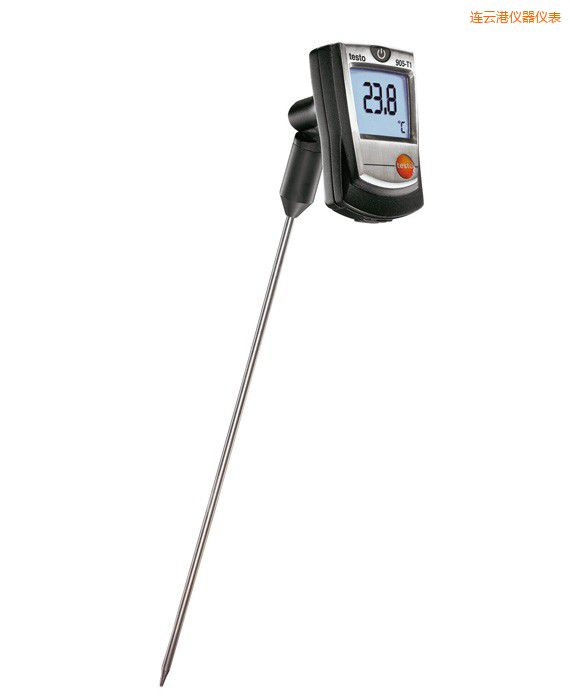 訂貨號:0560 9055 testo 905-T1刺入式溫度計,溫度計的構造圖,包括固定夾和電池。