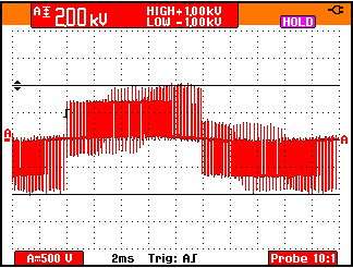 50 Hz馬達驅(qū)動輸出電壓的脈寬調(diào)制信號的細節(jié)。1000V,50 微秒的脈沖即導(dǎo)致某些測試設(shè)備的不穩(wěn)定。