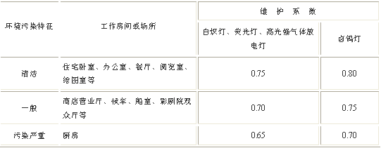 第2.1.4條 在照明設計時應根據(jù)光源的光通衰減、燈具積塵和房間表面污染引起照度值降低的程度,除以表2.1.4中的維護系數(shù)。