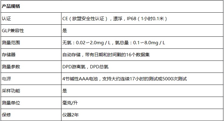 900測量儀的特點(diǎn)時(shí)可以快速準(zhǔn)確地測量游離氯或總氯含量: •自動(dòng)數(shù)據(jù)存儲(chǔ)功能;能夠存儲(chǔ)具有日期和時(shí)間標(biāo)記的16個(gè)數(shù)據(jù)集 •大型背光LCD顯示屏 •IP68防水外殼;易于固定或放置在臺(tái)面上;可漂浮 •遮光罩,,可防止容易損壞或丟失的移動(dòng)部件或單獨(dú)部件的移動(dòng) •用戶校準(zhǔn)功能 •可以根據(jù)特定的范圍要求,,提高分辨率 •可以針對采樣過程對于已知的干擾進(jìn)行調(diào)整 •自動(dòng)關(guān)閉功能 •2年的保修期